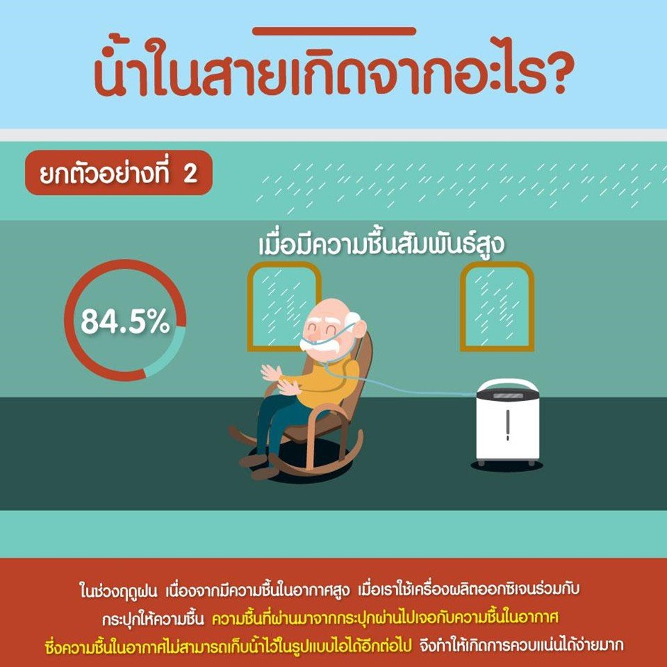 2.เมื่อมีความชื้นสัมพัทธ์สูง กรณีนี้จะพบได้บ่อยมาก ๆ ในช่วงฤดูฝน เนื่องจากมีความชื้นในอากาศสูง เมื่อเราใช้เครื่องผลิตออกซิเจนร่วมกับ กระปุกให้ความชื้น ความชื้นที่ผ่านมาจากกระปุกผ่านไปเจอกับความชื้นในอากาศ ซึ่งความชื้นในอากาศไม่สามารถเก็บน้ำไว้ในรูปแบบไอได้อีกต่อไป จึงทำให้เกิดการควบแน่นได้ง่ายมาก