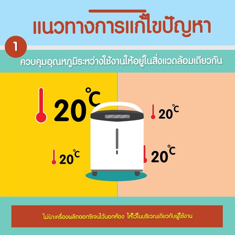 1.ควบคุมอุณหภูมิระหว่างใช้งานให้อยู่ในสิ่งแวดล้อมเดียวกัน กล่าวคือ ไม่นำเครื่องผลิตออกซิเจนไว้นอกห้อง ให้ไว้ในบริเวณเดียวกับผู้ใช้งาน