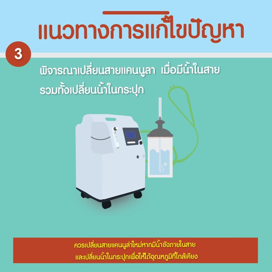 3.พิจารณาเปลี่ยนสายแคนนูล่า เมื่อมีน้ำในสาย รวมทั้งเปลี่ยนน้ำในกระปุกให้ความชื้นเพื่อให้อุณหภูมน้ำกับอุณหภูมิห้องเป็นอุณภูมิที่ใกล้เคียงกัน