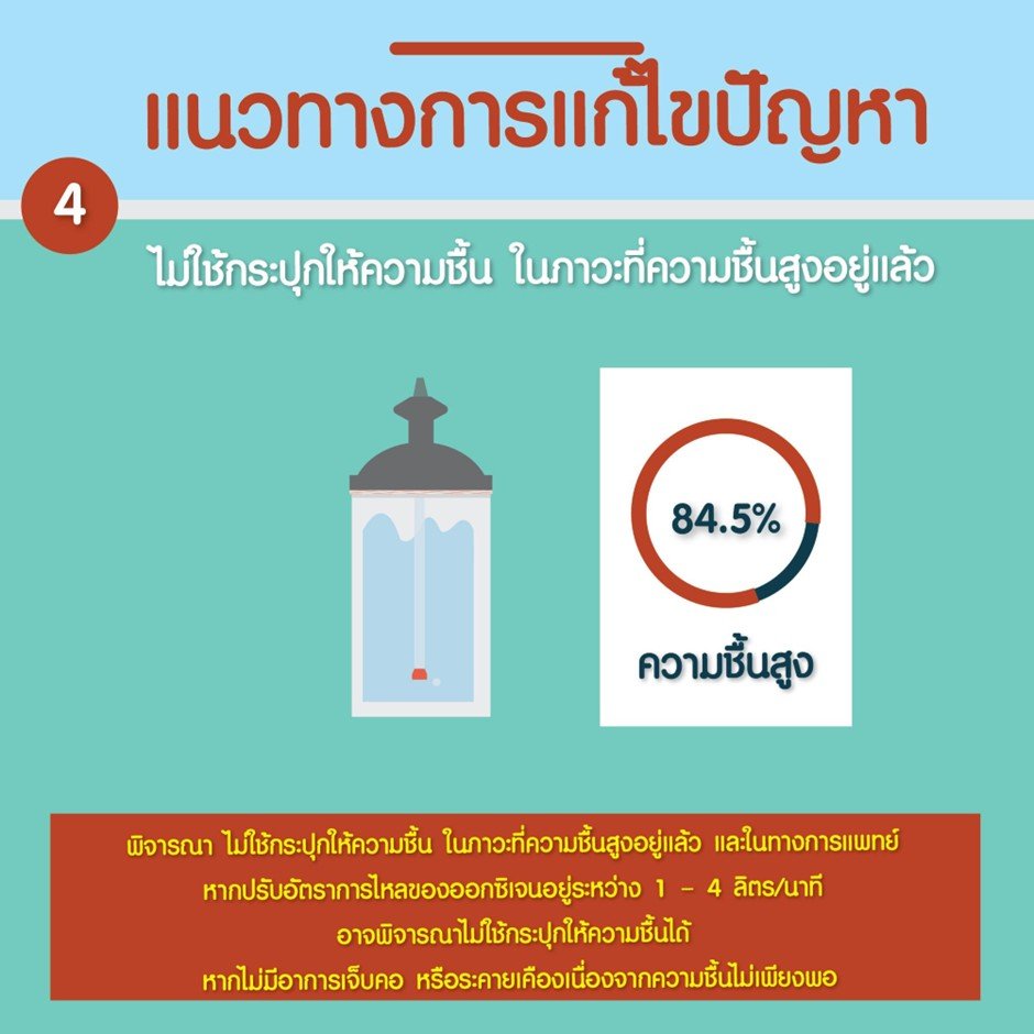 4.พิจารณา ไม่ใช้กระปุกให้ความชื้น ในภาวะที่ความชื้นสูงอยู่แล้ว และในทางการแพทย์ หากปรับอัตราการไหลของออกซิเจนอยู่ระหว่าง 1 – 4 ลิตร/นาที อาจพิจารณาไม่ใช้กระปุกให้ความชื้นได้ หากไม่มีอาการเจ็บคอ หรือระคายเคืองเนื่องจากความชื้นไม่เพียงพอ