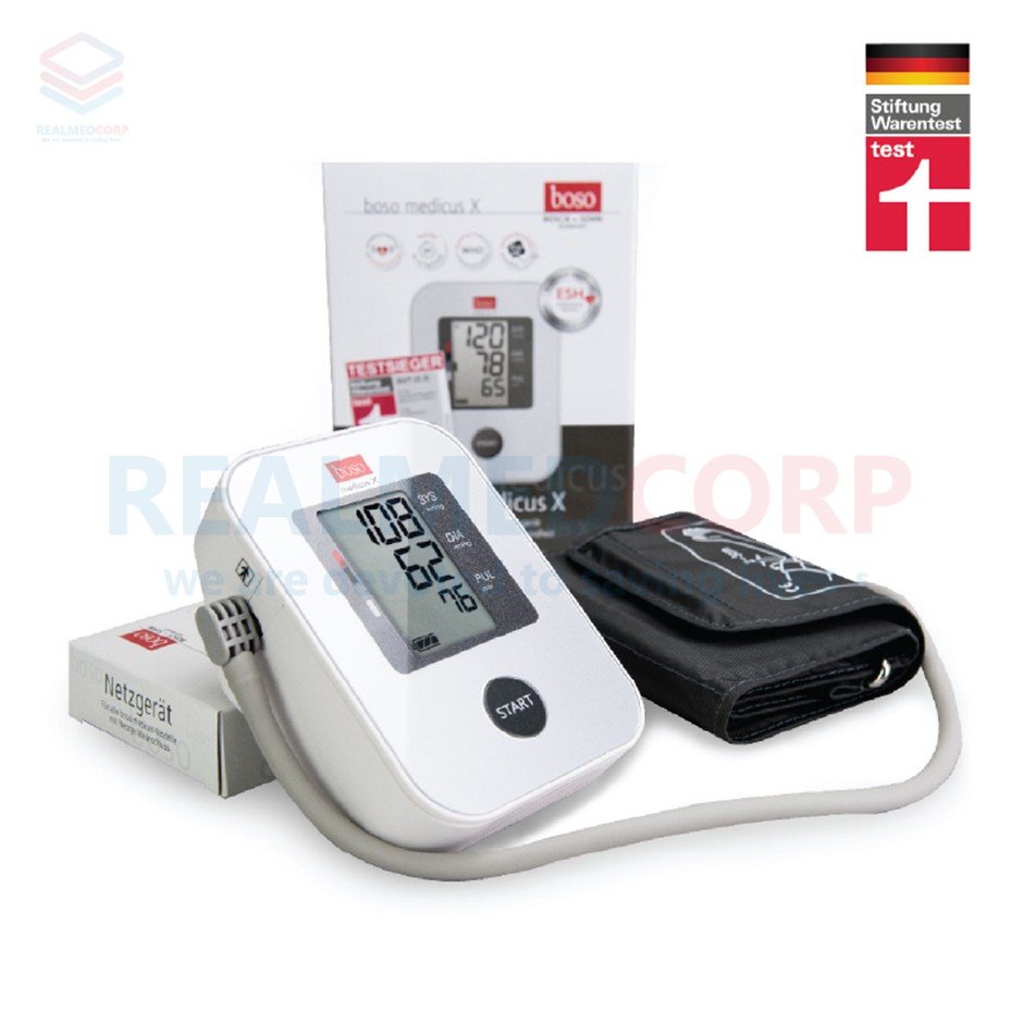 การเลือกอุปกรณ์ที่มีเหมาะสมและมีคุณภาพก็เช่นกัน Realmedcorp มีเครื่องสำหรับวัดความดันโลหิตที่สามารถวัดค่าได้อย่างแม่นยำ โดยผลิตภัณฑ์มาจากประเทศเยอรมนี ยี่ห้อ Boso รุ่น Medicus X ซึ่งได้รับมาตรฐานรับรองจาก ESH (European Society of Hypertension), จอแสดงผลยังสามารถบอกระดับความดันโลหิตได้ตามมาตรฐาน WHO (World Health Organization) กำหนด สำคัญที่สุดที่เป็นจุดขายและถือว่าเป็นการคืนกำไรให้ลูกค้าการรับประกันสินค้า เนื่องจากเครื่องวัดความดันโลหิต ยี่ห้อ Boso รุ่น Medicus X นั้นมีการรับประกันสินค้าที่ยาวนานถึง 5 ปี