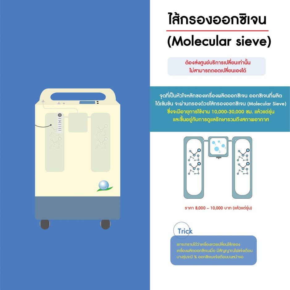 กระบอกสารผลิตออกซิเจน (Molecular sieve) หรือเรียกง่ายๆ ว่า ไส้กรองออกซิเจน ซึ่งไส้กรองออกซิเจนนี้จะมีอายุการใช้งานในแต่ละรุ่นของเครื่องผลิตออกซิเจน เมื่อครบอายุการใช้งานของเครื่องผลิตออกซิเจนแล้ว จะทำให้ความเข้มข้นของออกซิเจนต่ำกว่ามาตรฐานของเครื่องได้ เมื่อถึงเวลานั้นจะแนะนำเปลี่ยนไส้กรองออกซิเจน ราคาประมาณ 8,000 – 10,000 บาท หรือบางท่านอาจจะพิจารณาเลือกเป็นซื้อเครื่องใหม่แทนแล้วแต่ความเหมาะสม