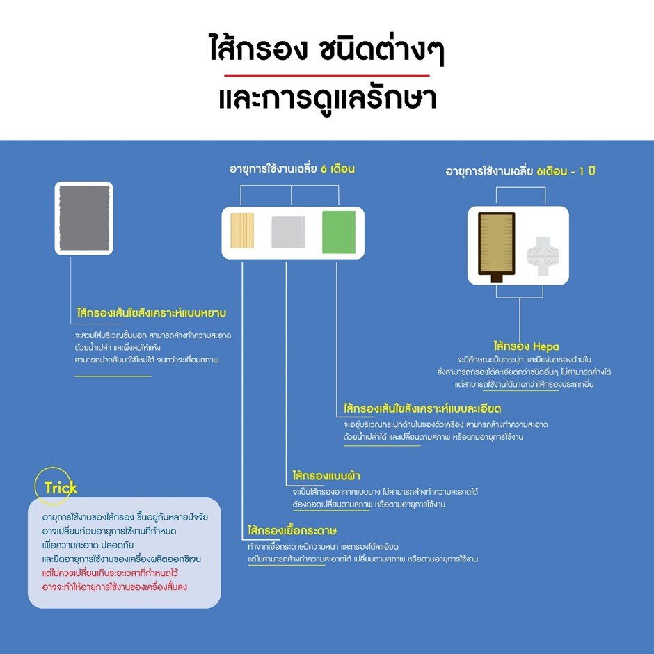 เป็นไส้กรองแบบละเอียด และหนา สามารถล้างทำความสะอาดได้ด้วยน้ำเปล่า และเปลี่ยนตามอายุการใช้งาน เฉลี่ย 6 เดือน
